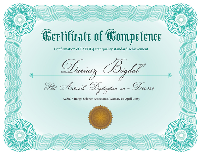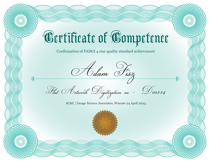 Dysponujemy profesjonalnym zapleczem technicznym w tym sprzętem oświetleniowym, dedykowanymi wzornikami kolorów, oprogramowaniem do postprodukcji oraz średnioformatowym sprzętem fotograficznym z wysokiej jakości optyką. Posiadamy również wiedzę, kwalifikacje i wieloletnie doświadczenie, które potwierdzają certyfikaty kompetencji FADGI z najwyższą oceną jakości.